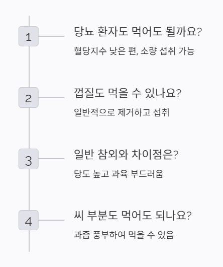 씨 부분도 먹어도 되나요?네, 참외 씨 부분은 과즙이 풍부하고 부드러워 대부분 먹을 수 있지만, 기호에 따라 제거해도 무방합니다.